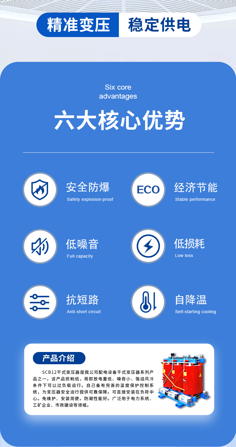 壓器、有載調壓電力變壓器、非晶合金變壓器、SC(B)10 (13)、SG(B)10(13)及SC(B)14(18)新能效系列干式變壓器、開關柜及組合式變壓器、箱式變電站及防竊電、礦用、整流、電爐等特殊電力變壓器。產品廣泛用于電力、核電站、交通、礦山、冶金、建筑、石化、化工、電氣化鐵道、地鐵、城市輕軌、軍隊國防、通訊、城鄉電網建設與改造等行業的輸配電系統,熱銷全國。